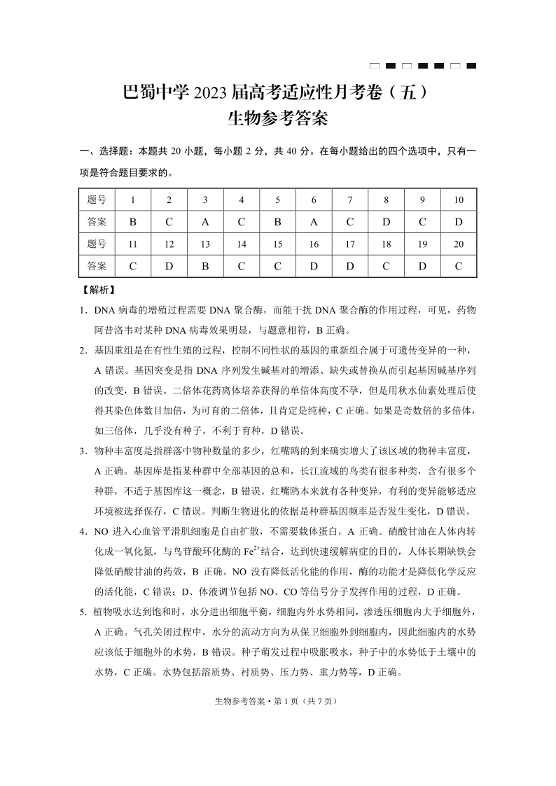 高三生物答案-重庆市巴蜀中学2023届高考适应性月考卷(五)
