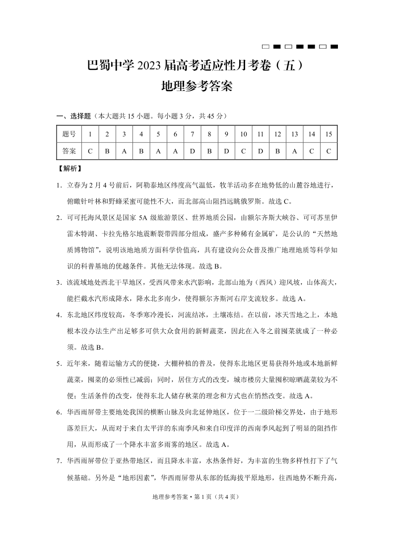 高三地理答案-重庆市巴蜀中学2023届高考适应性月考卷(五)