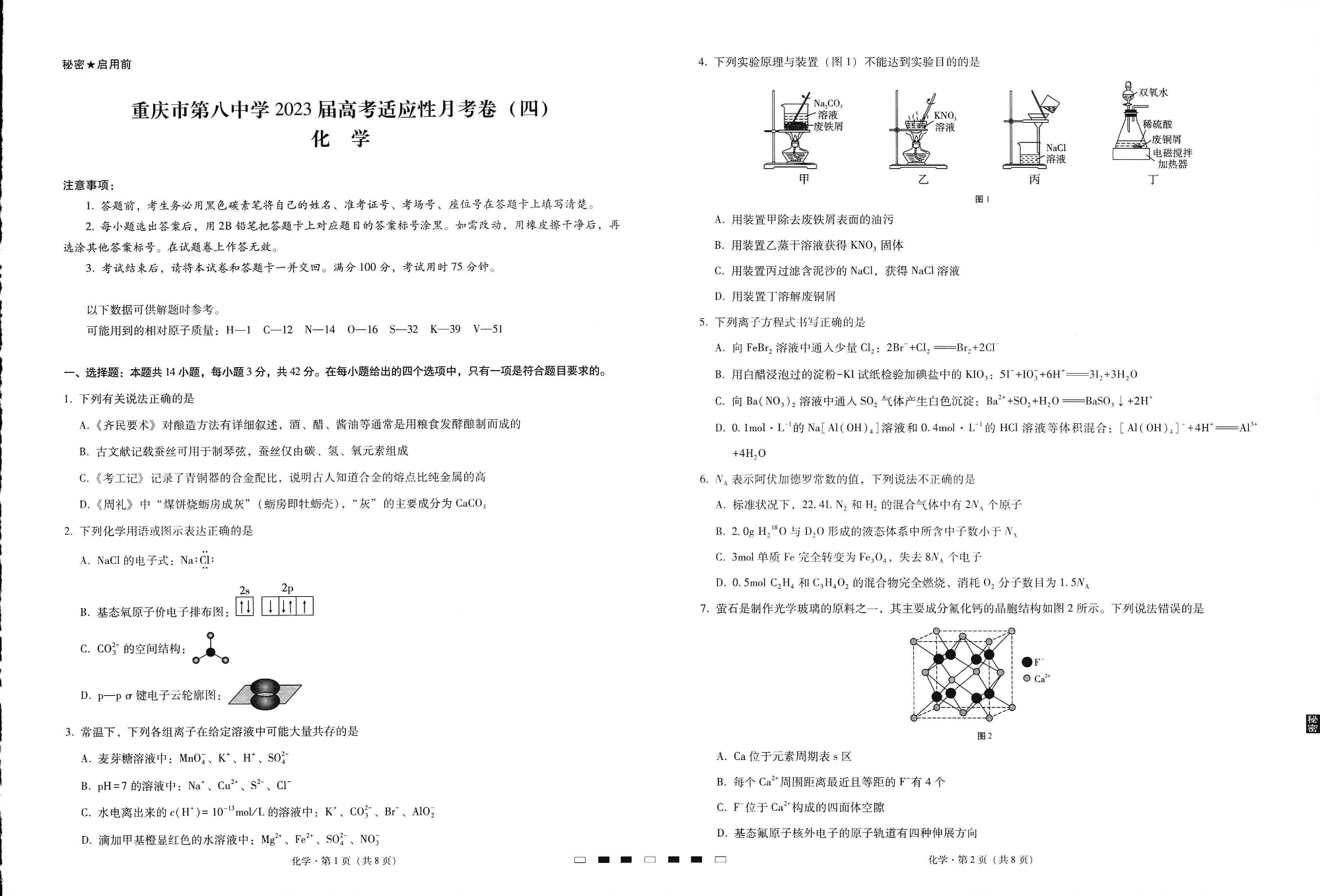 高三化学-重庆市第八中学2023届高考适应性月考卷(四)