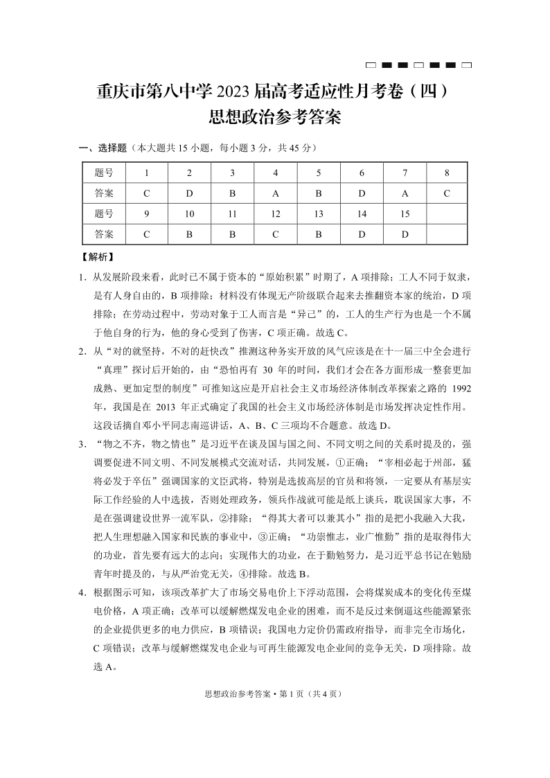 高三政治答案-重庆市第八中学2023届高考适应性月考卷(四)