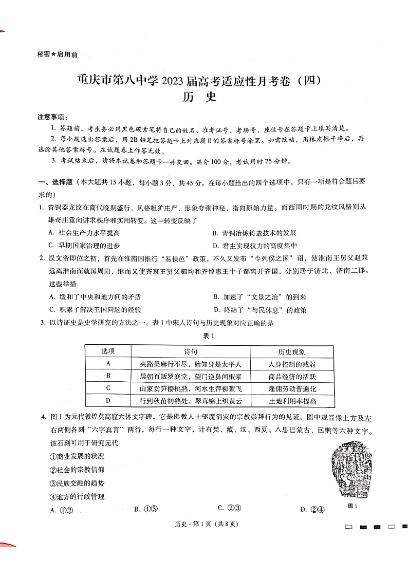 高三历史-重庆市第八中学2023届高考适应性月考卷(四)