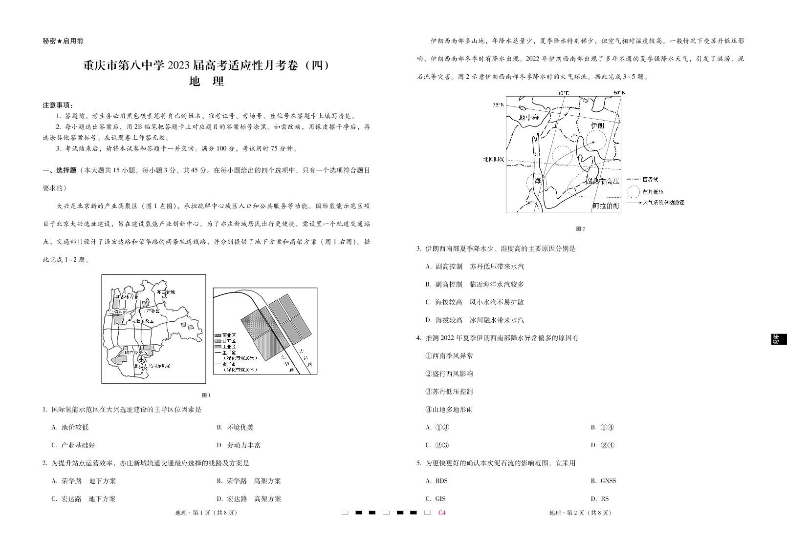 高三地理-重庆市第八中学2023届高考适应性月考卷(四)