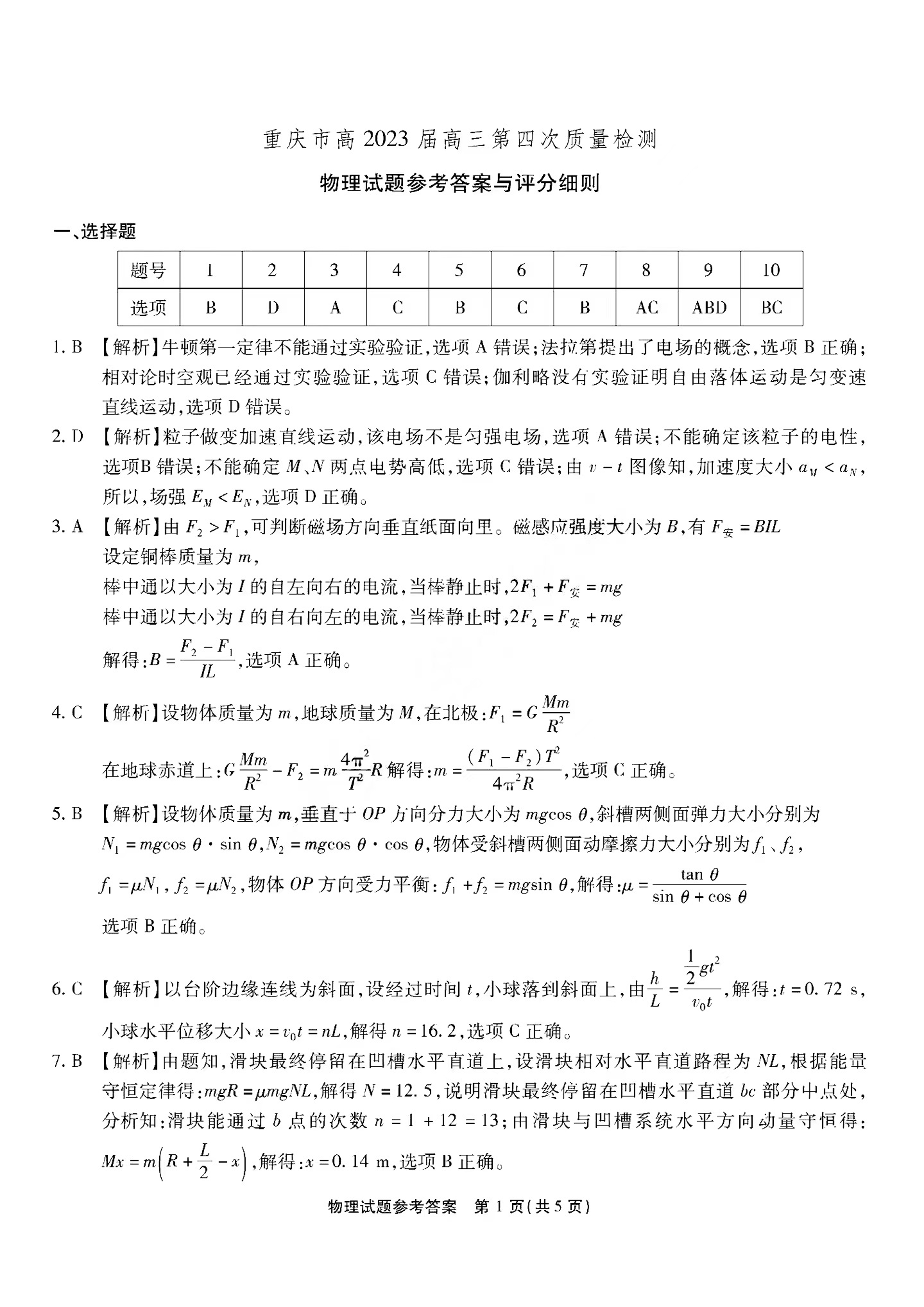 高三物理答案-重庆市南开中学2023届高三质量检测(四)