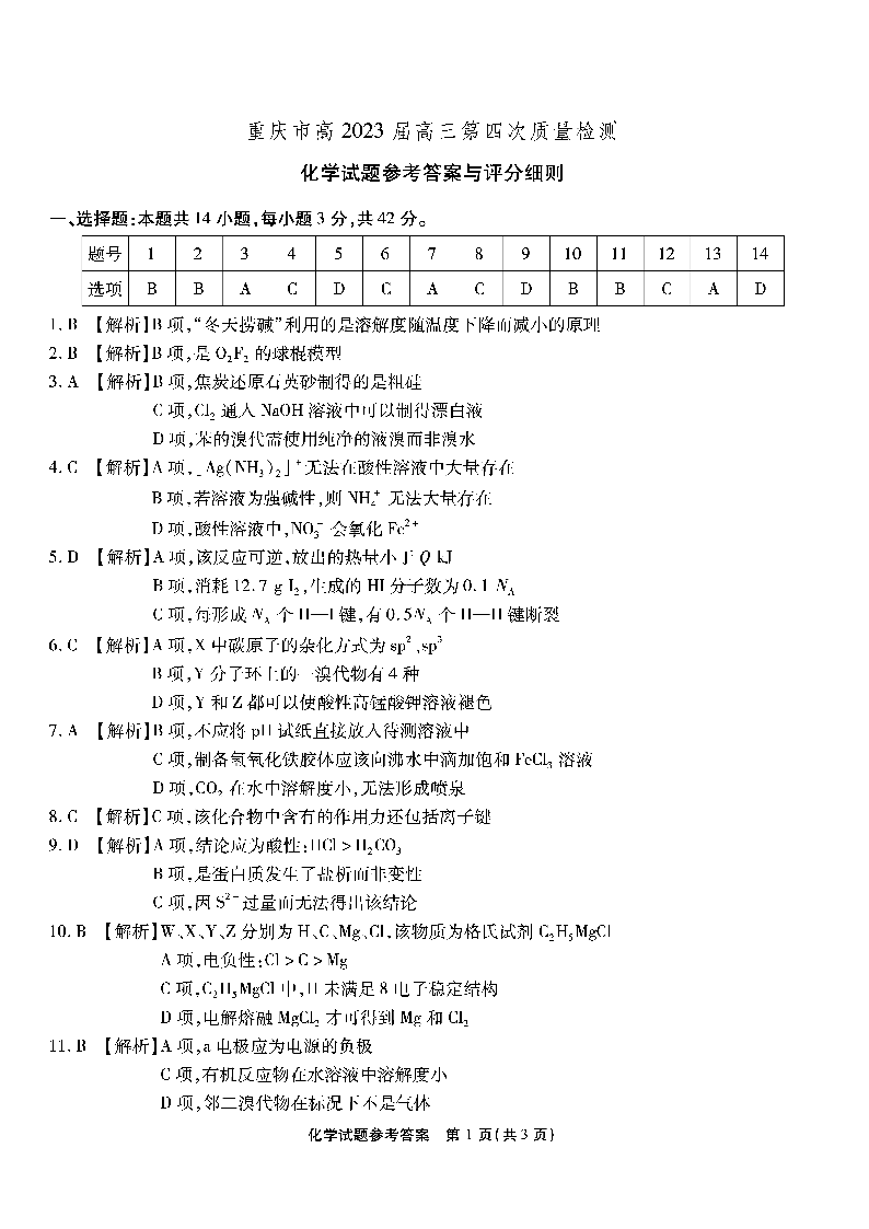 高三化学答案-重庆市南开中学2023届高三质量检测(四)