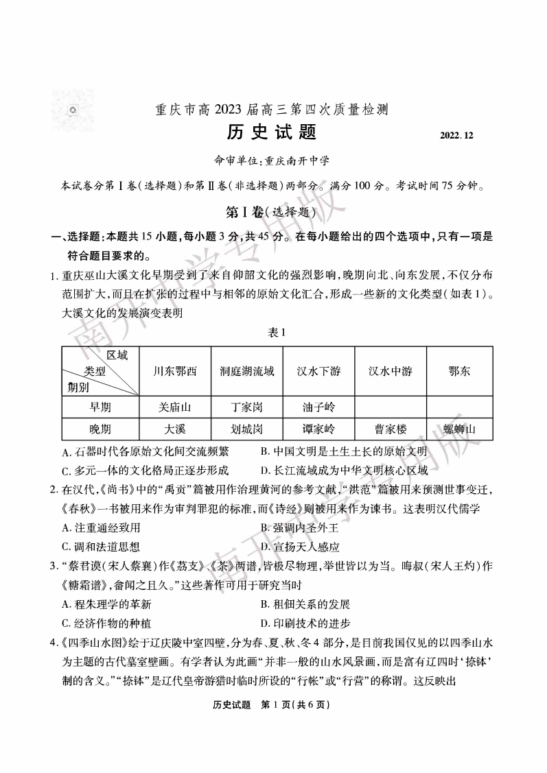 高三历史-重庆市南开中学2023届高三质量检测(四)