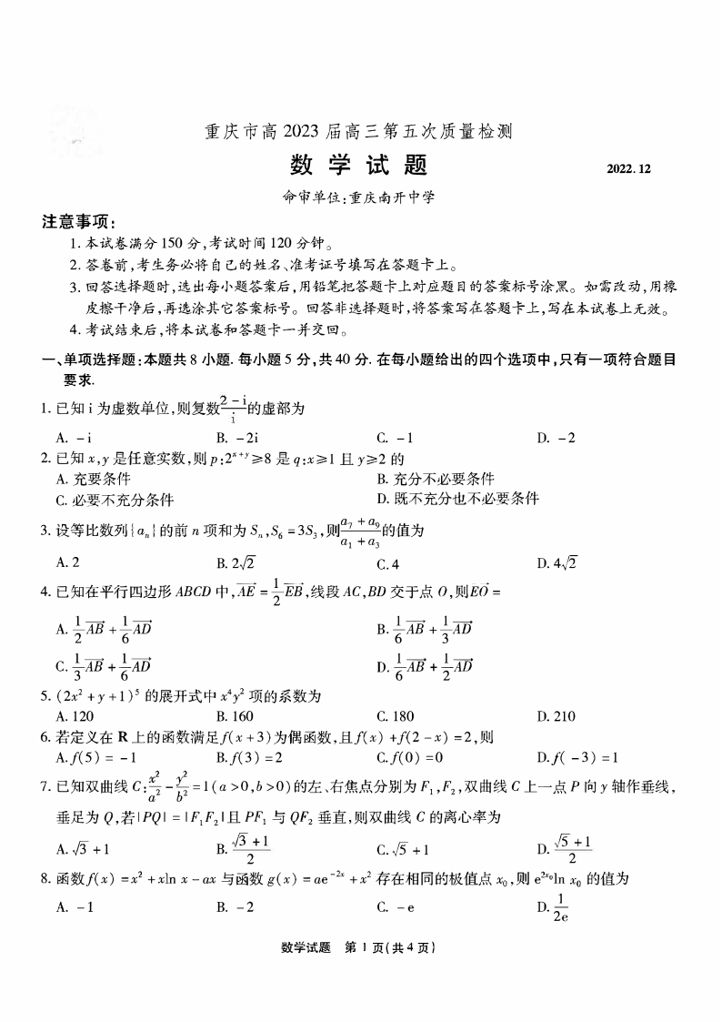 高三数学-重庆市南开中学2023届高三质量检测(五)