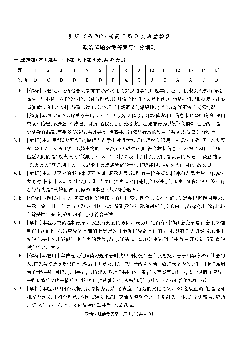 高三政治答案-重庆市南开中学2023届高三质量检测(五)