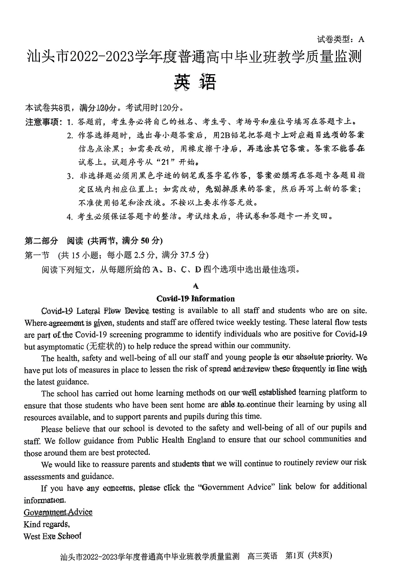 高三英语-广东省汕头市2023届高三上学期12月教学质量监测