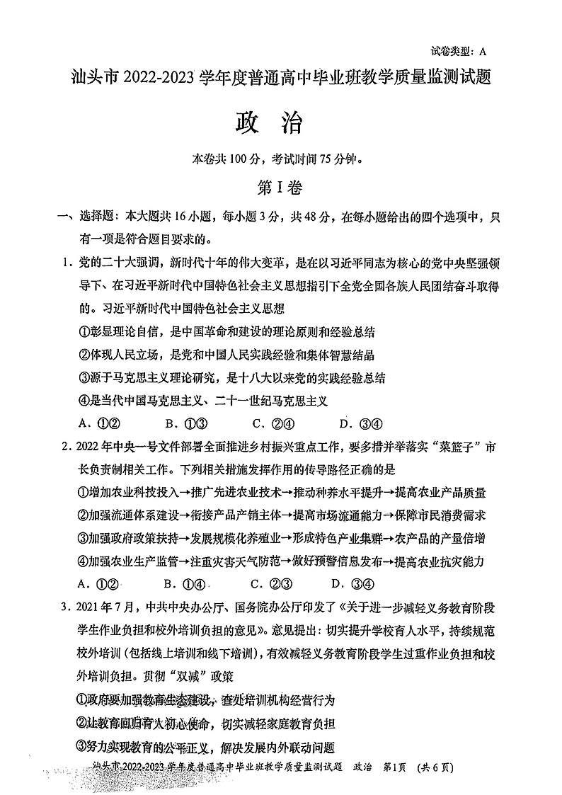 高三政治-广东省汕头市2023届高三上学期12月教学质量监测