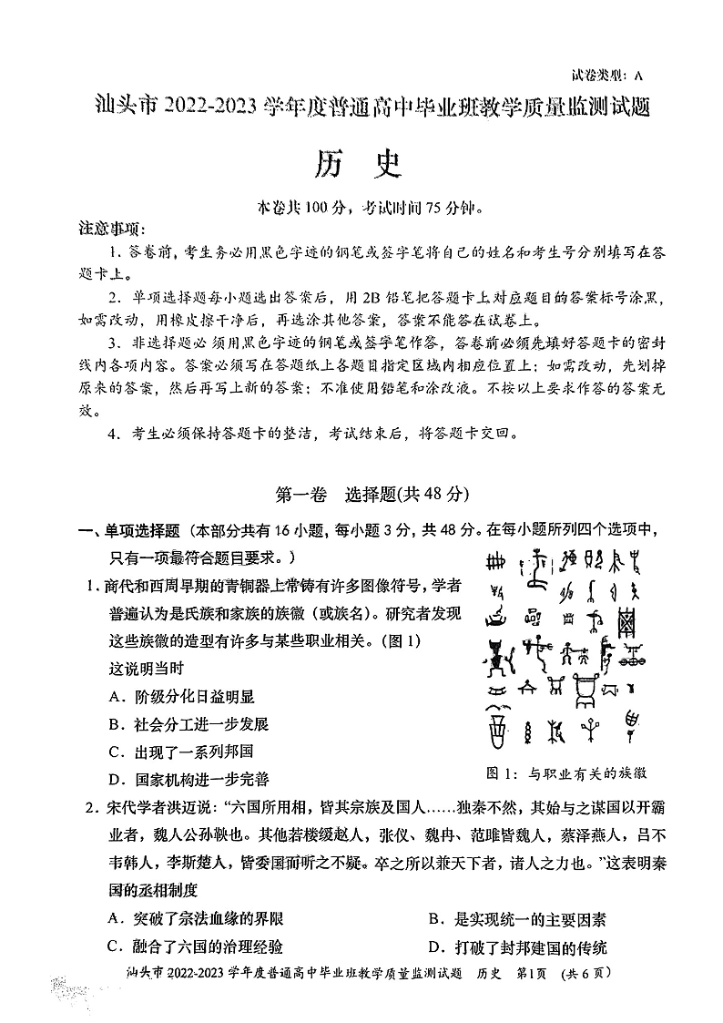 高三历史-广东省汕头市2023届高三上学期12月教学质量监测