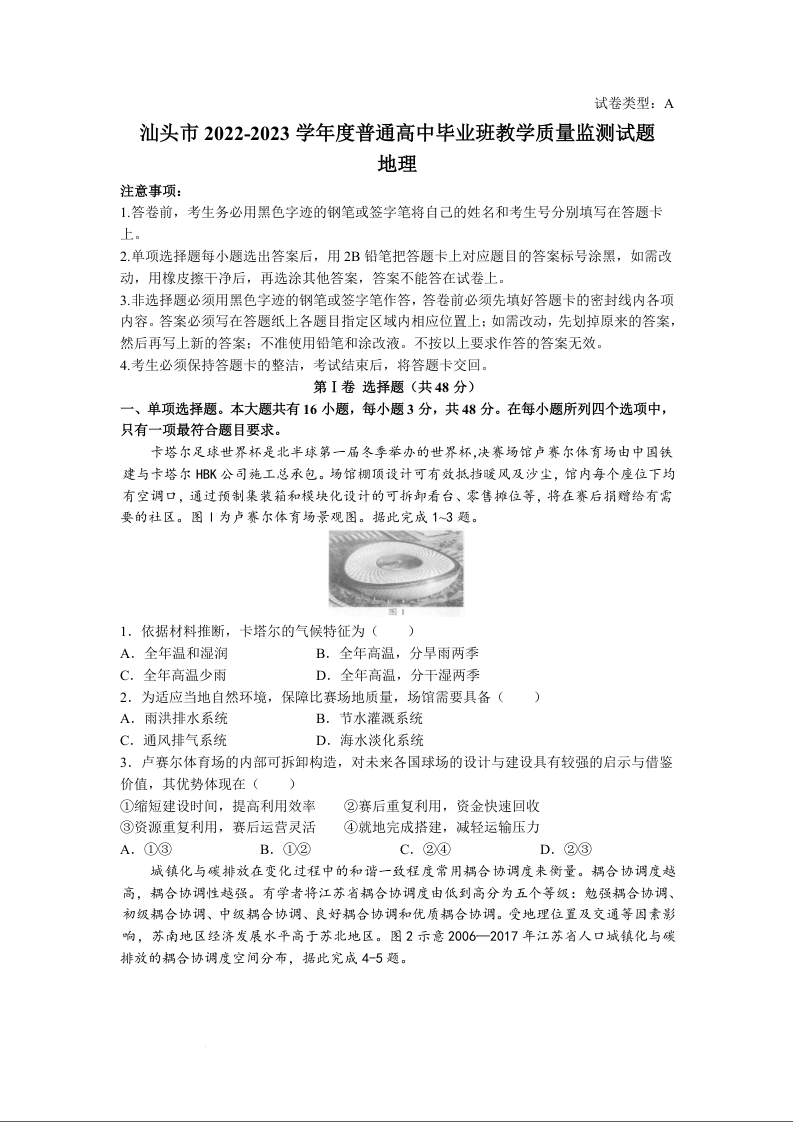 高三地理-广东省汕头市2023届高三上学期12月教学质量监测