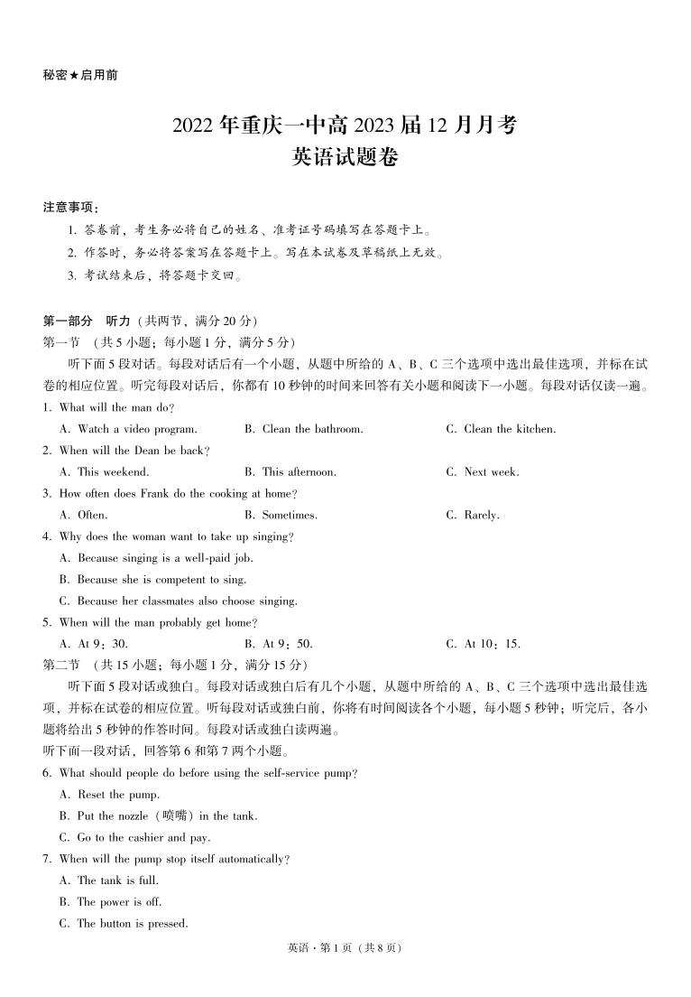 高三英语-重庆一中2022年高2023届12月月考