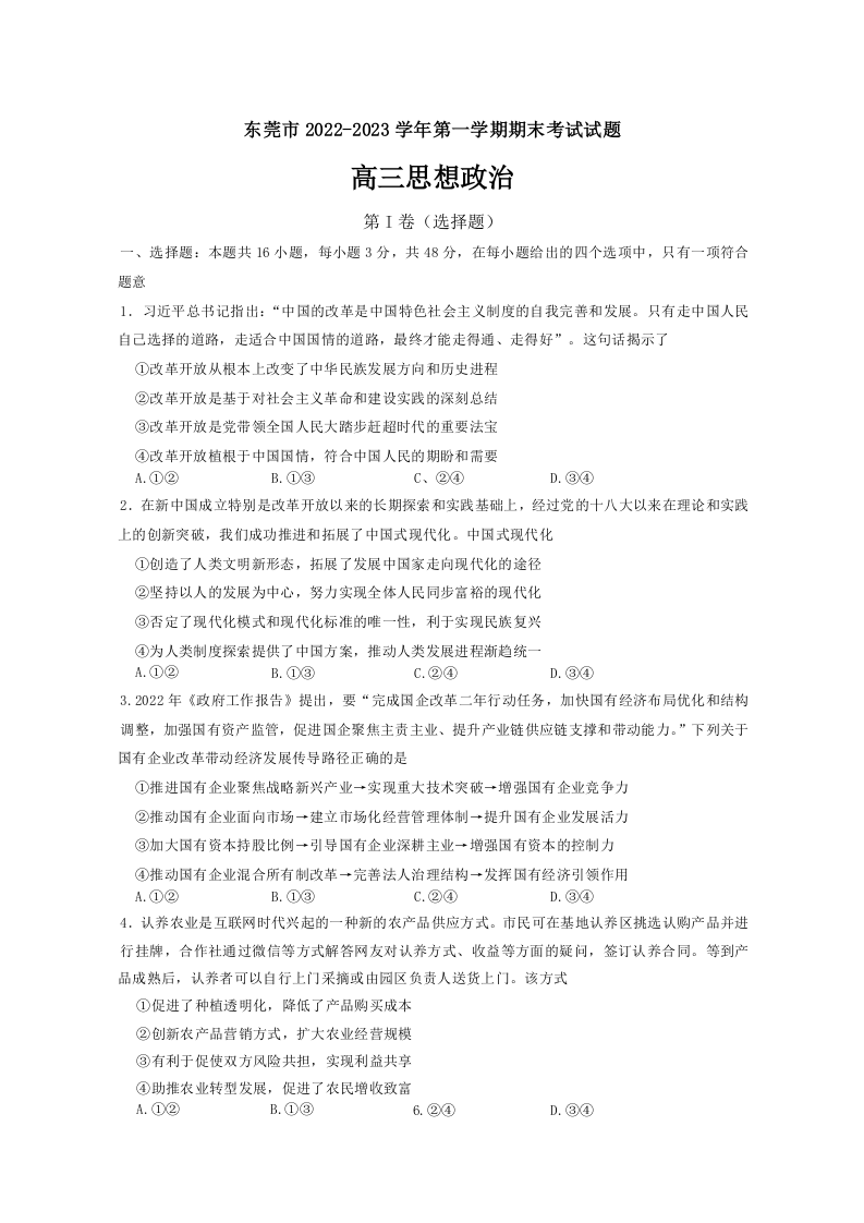 高三政治+答案-广东省东莞市2023届高三上学期期末教学质量检查