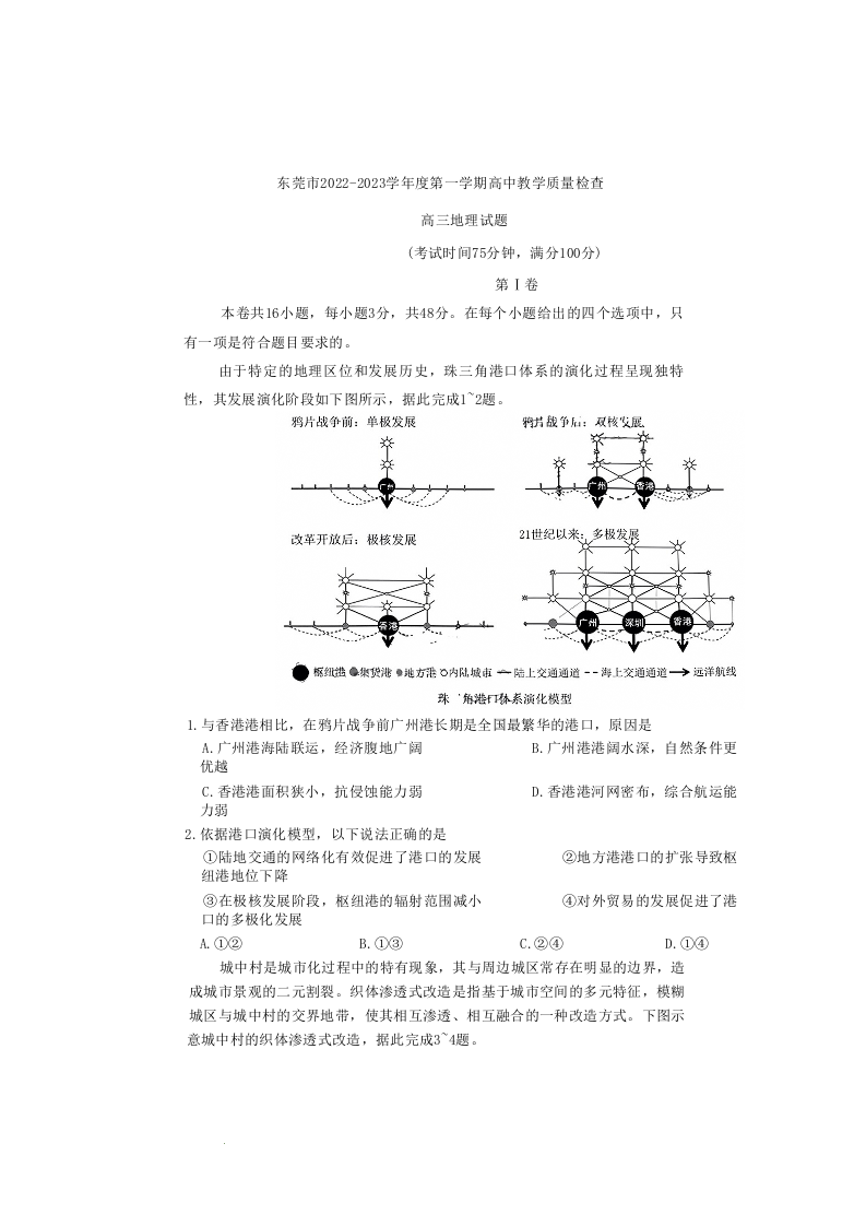 高三地理-广东省东莞市2023届高三上学期期末教学质量检查