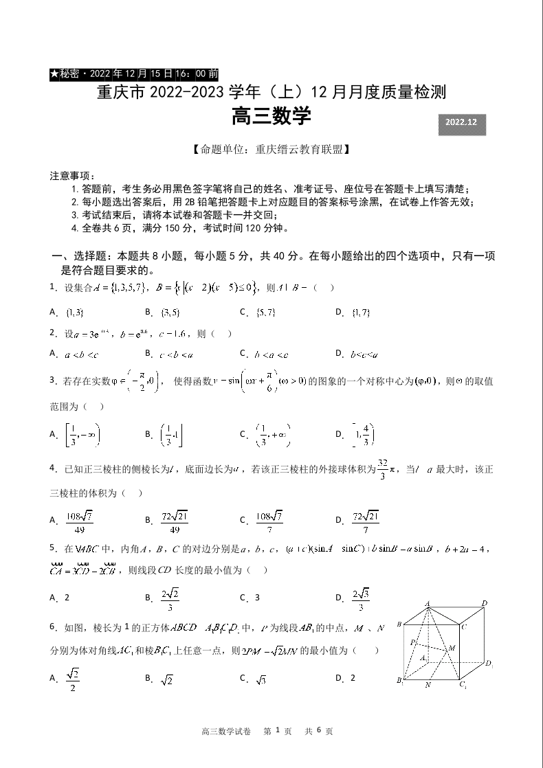 高三数学--重庆市缙云教育联盟2022-2023学年高三上学期12月质量监测