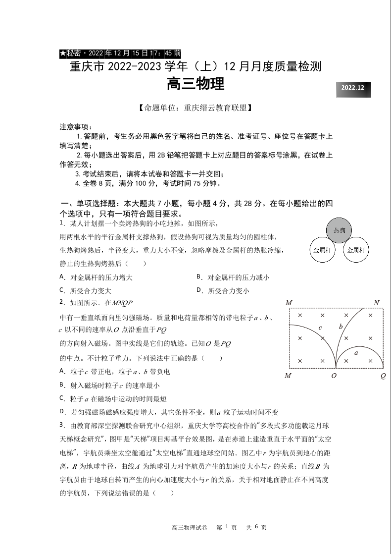 高三物理--重庆市缙云教育联盟2022-2023学年高三上学期12月质量监测