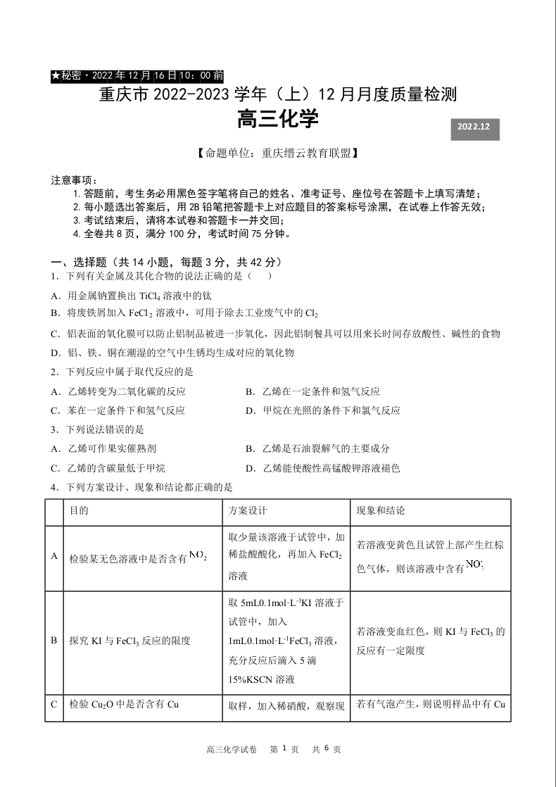 高三化学--重庆市缙云教育联盟2022-2023学年高三上学期12月质量监测