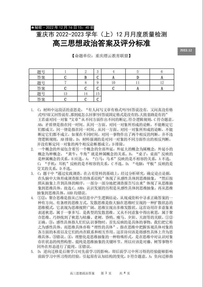 高三政治答案--重庆市缙云教育联盟2022-2023学年高三上学期12月质量监测