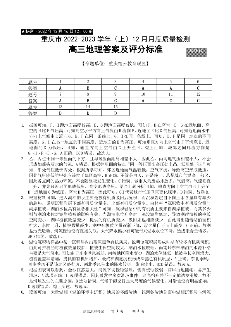 高三地理答案--重庆市缙云教育联盟2022-2023学年高三上学期12月质量监测