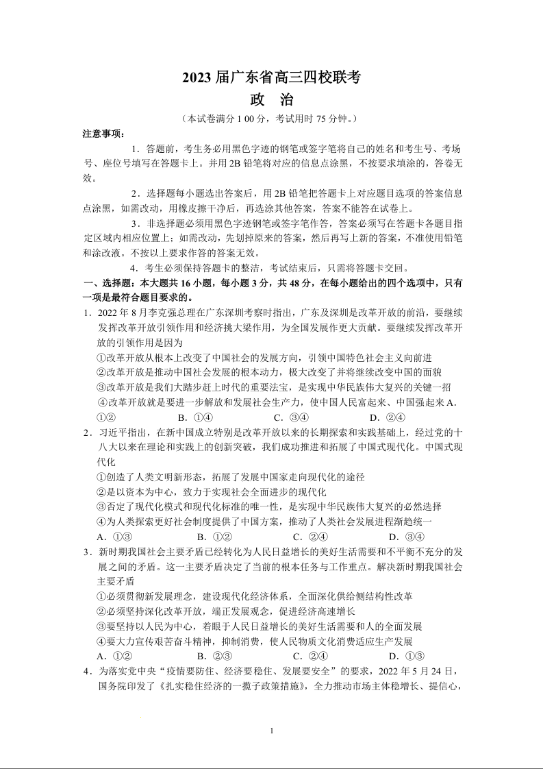 高三政治+答案-广东省四校 (深圳中学,华师附中,省实验,广雅)2023届高三上学期第一次联考