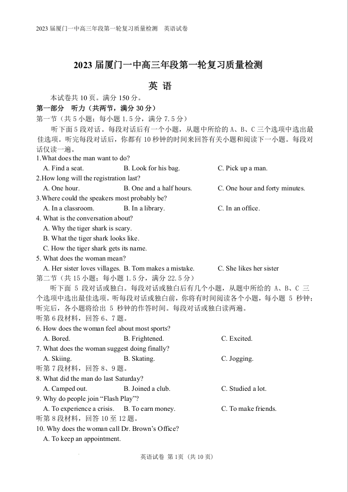 高三英语+答案-福建省厦门第一中学2022-2023学年高三上学期12月月考