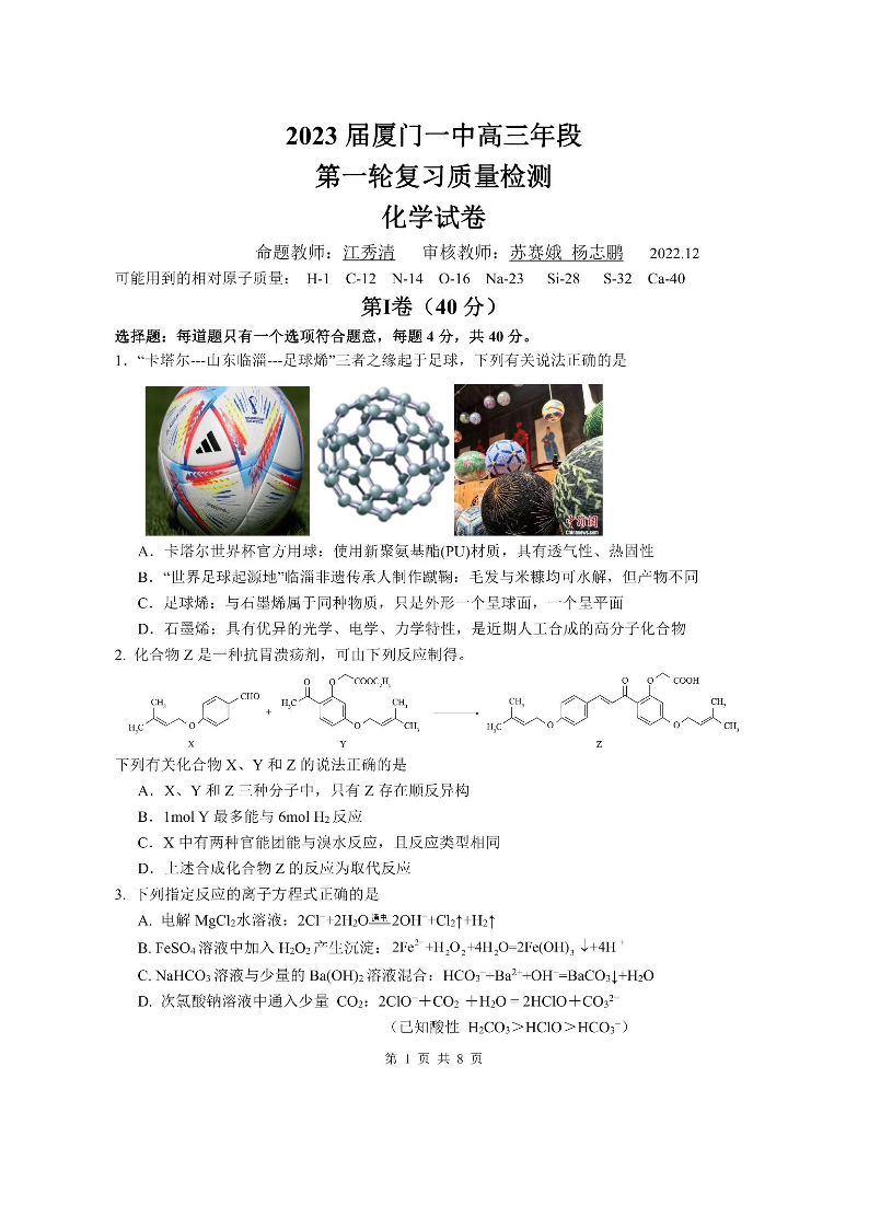 高三化学-福建省厦门第一中学2022-2023学年高三上学期12月月考