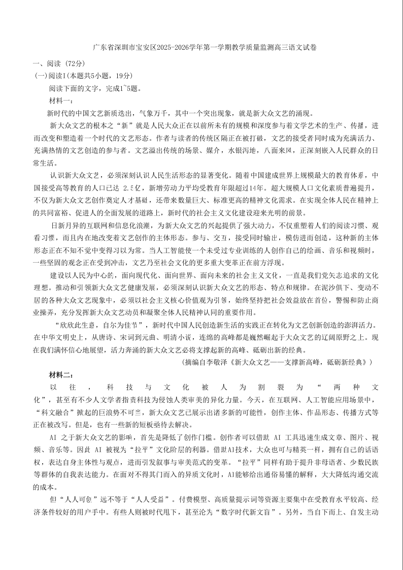 高三语文+答案--广东省深圳市宝安区2026届高三上学期10月教学质量检测