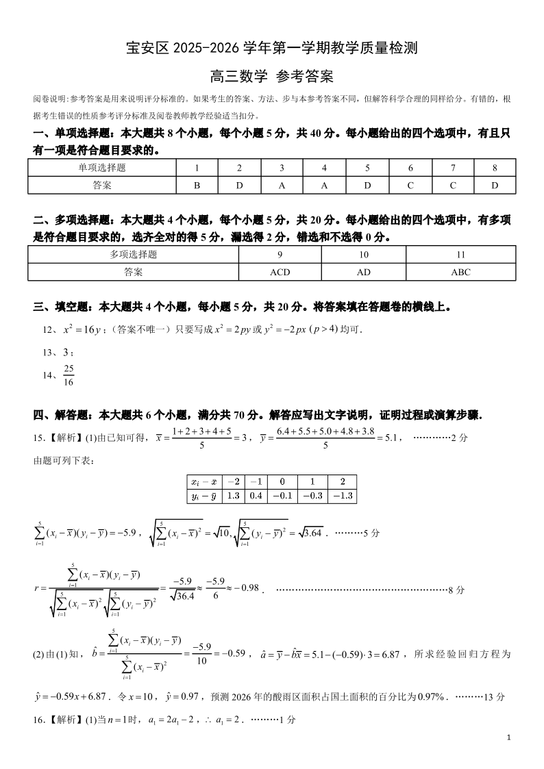 高三数学答案--广东省深圳市宝安区2026届高三上学期10月教学质量检测