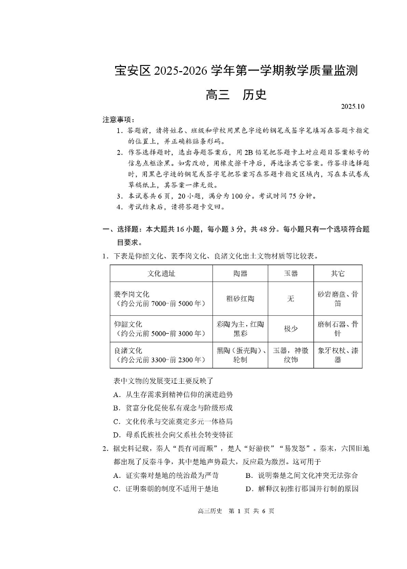 高三历史--广东省深圳市宝安区2026届高三上学期10月教学质量检测