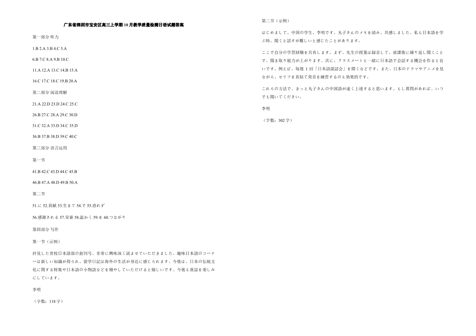 高三日语答案--广东省深圳市宝安区2026届高三上学期10月教学质量检测