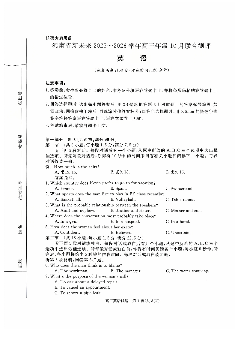 高三英语+答案--河南省新未来大联考2026届高三上学期10月联合测评