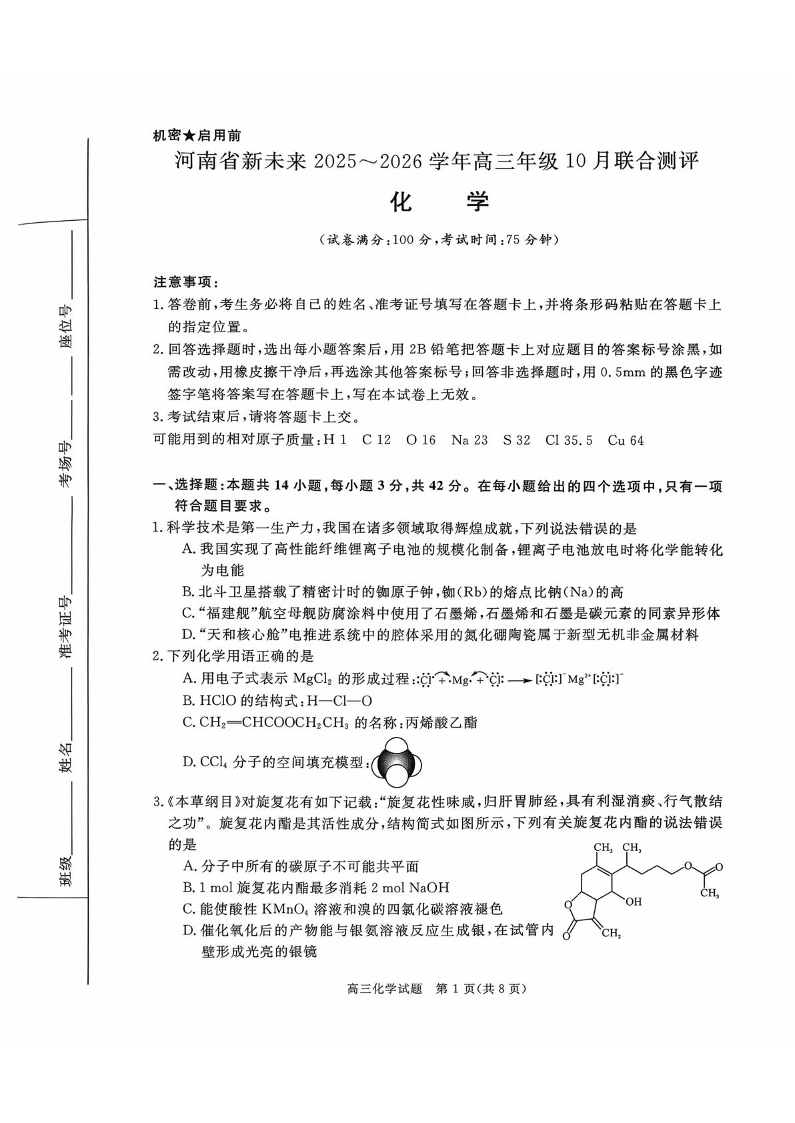 高三化学+答案--河南省新未来大联考2026届高三上学期10月联合测评