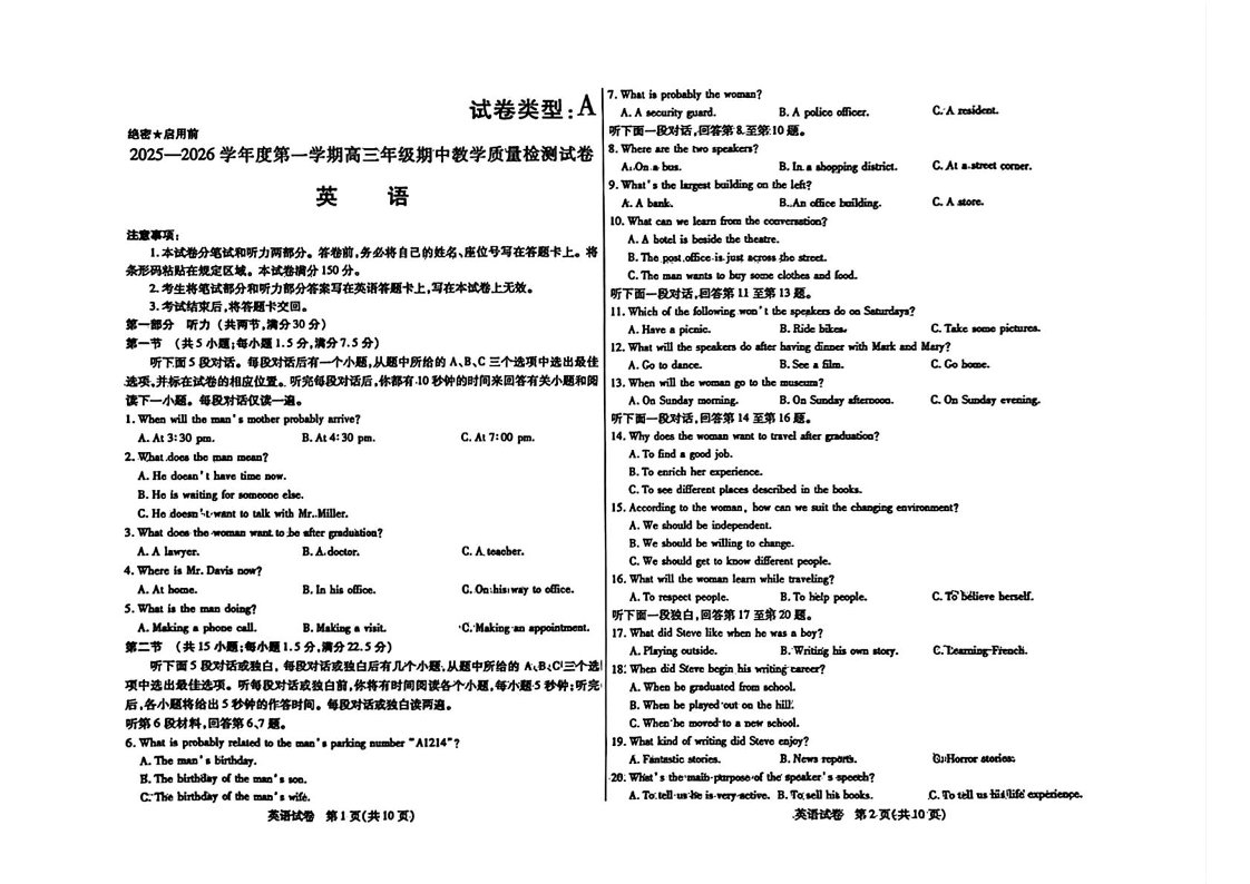 高三英语--内蒙古包头市2026届高三上学期期中教学质量检测