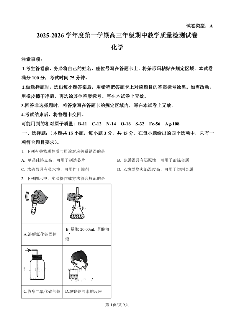 高三化学(原卷版)--内蒙古包头市2026届高三上学期期中教学质量检测