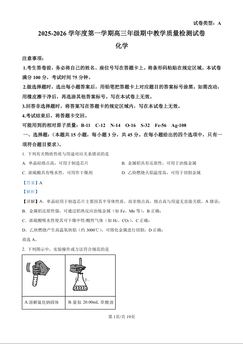 高三化学(精品解析版)--内蒙古包头市2026届高三上学期期中教学质量检测
