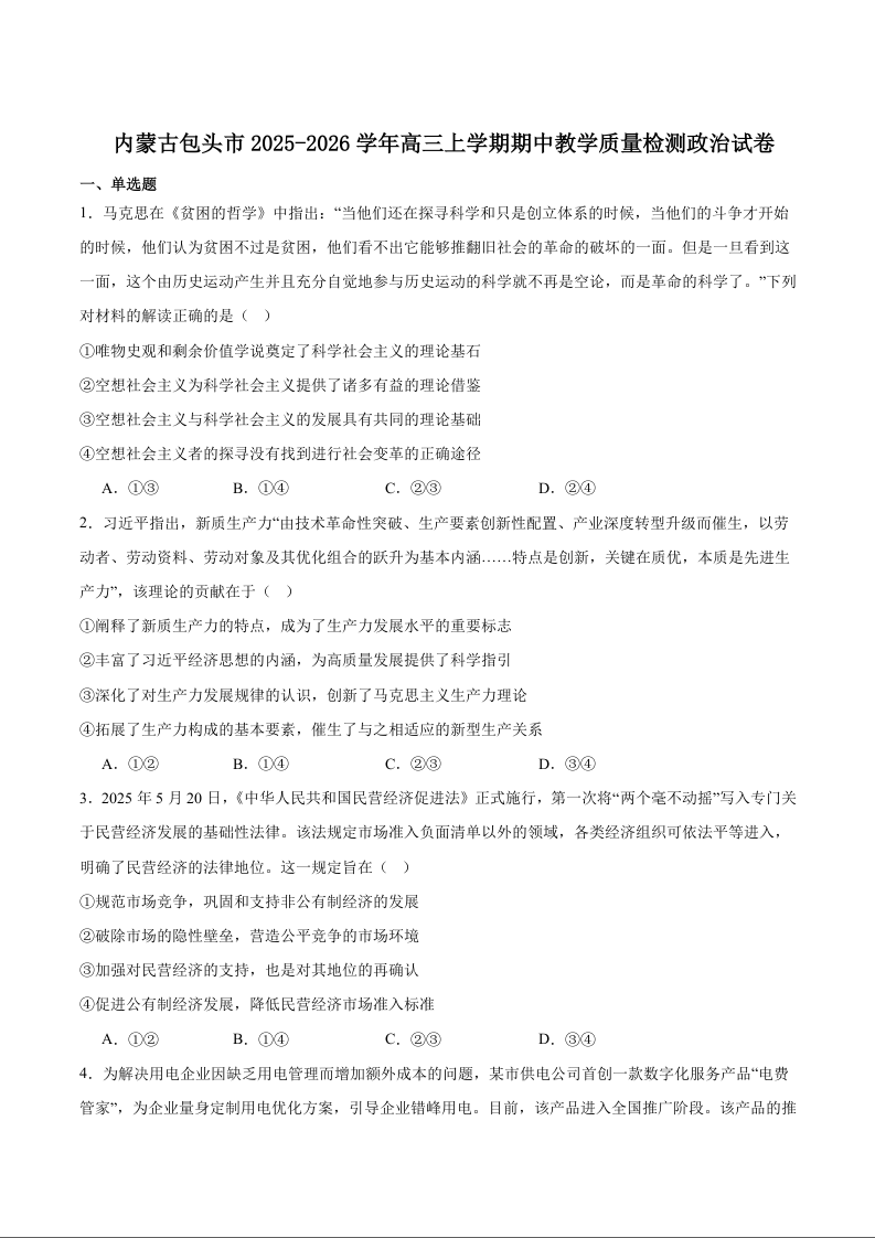 高三政治+答案--内蒙古包头市2026届高三上学期期中教学质量检测