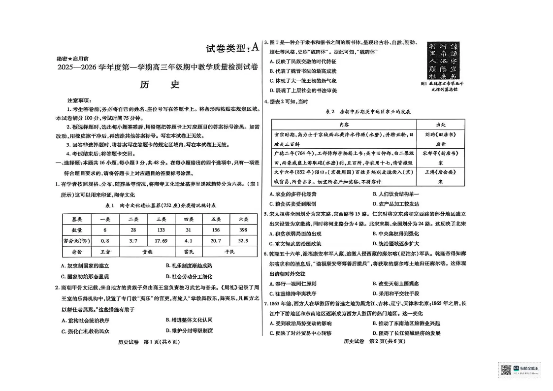 高三历史+答案--内蒙古包头市2026届高三上学期期中教学质量检测