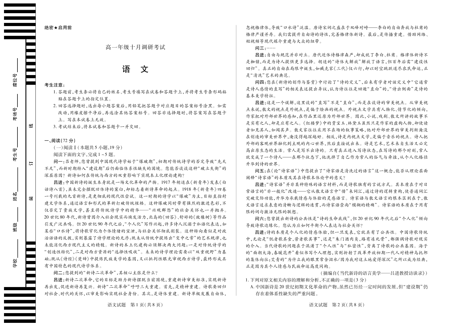 高一语文-安徽省天一大联考2025-2026学年上学期高一年级10月调研考试