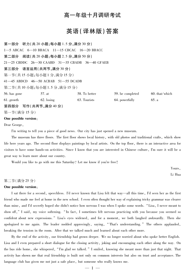 高一英语(译林)答案-安徽省天一大联考2025-2026学年上学期高一年级10月调研考试