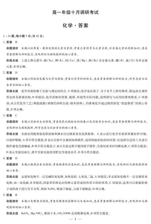 高一化学答案--安徽省天一大联考2025-2026学年上学期高一年级10月调研考试