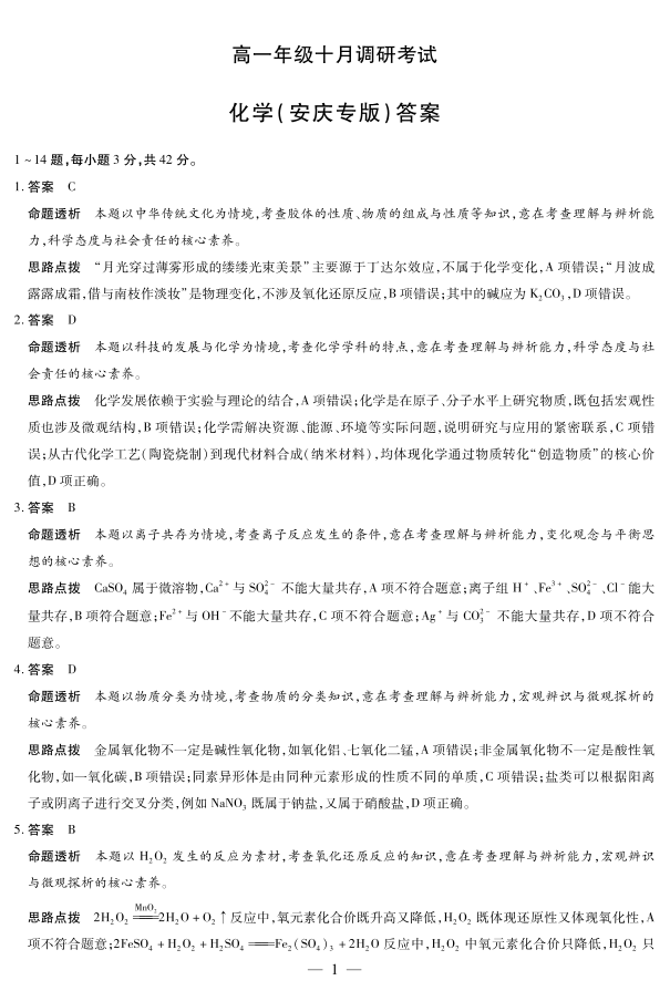 高一化学(安庆专版)答案--安徽省天一大联考2025-2026学年上学期高一年级10月调研考试