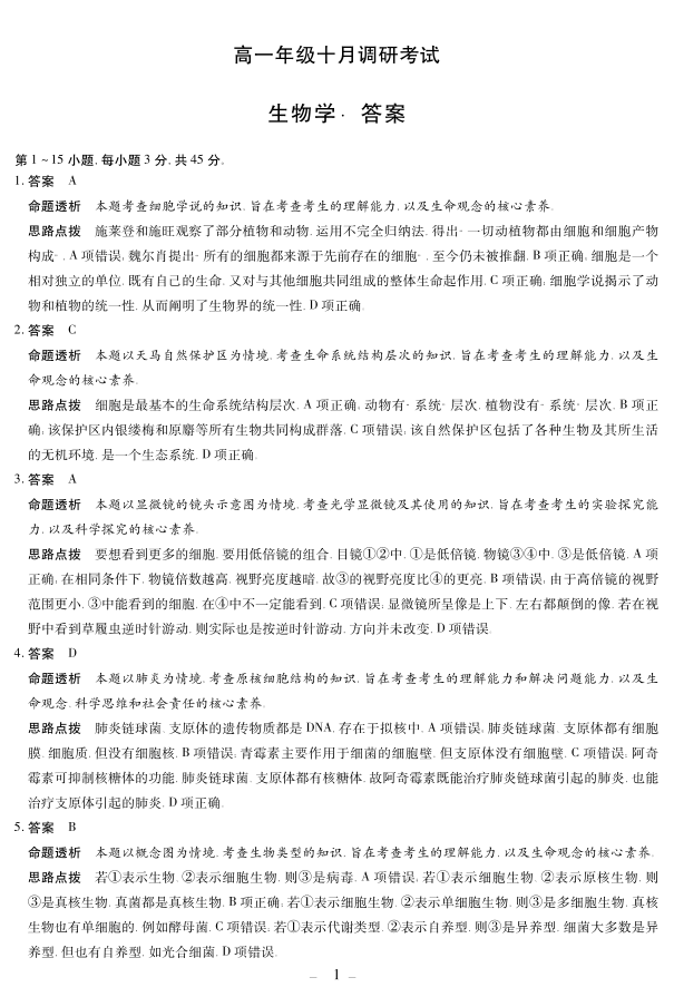 高一生物答案--安徽省天一大联考2025-2026学年上学期高一年级10月调研考试