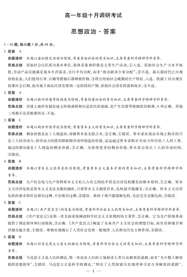高一政治答案-安徽省天一大联考2025-2026学年上学期高一年级10月调研考试