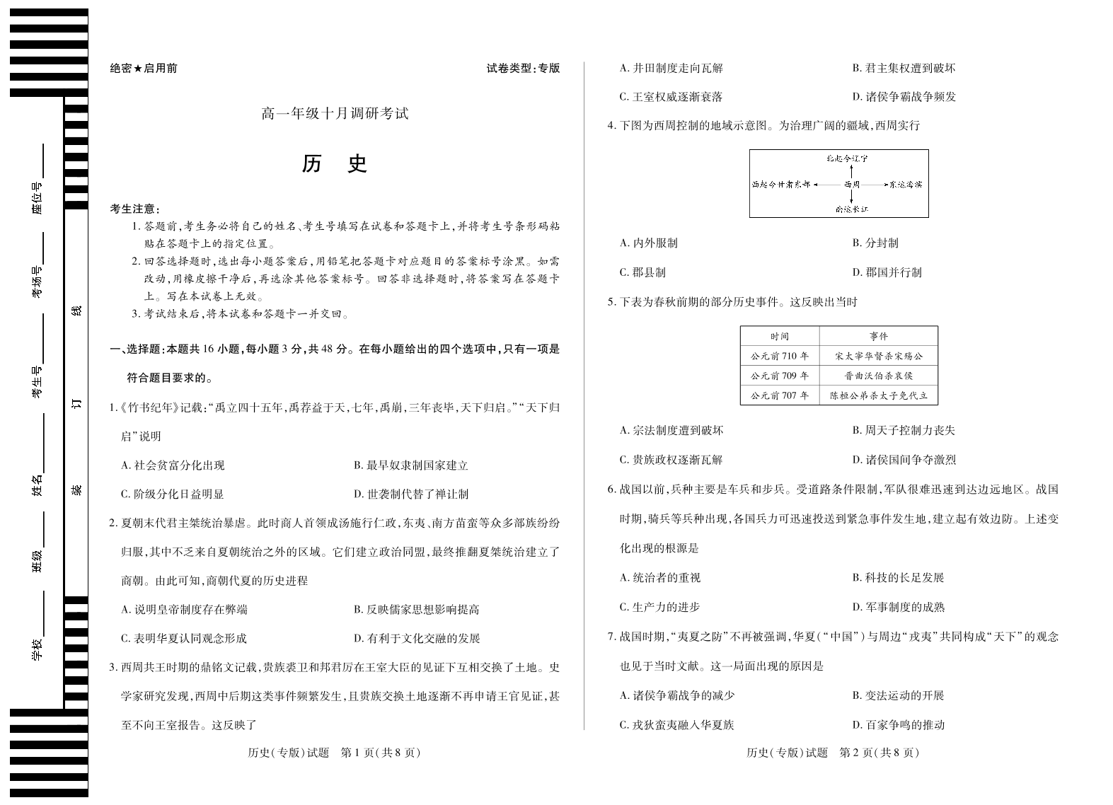 高一历史(专版)--安徽省天一大联考2025-2026学年上学期高一年级10月调研考试