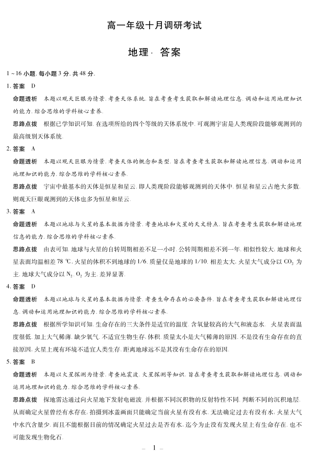 高一地理答案--安徽省天一大联考2025-2026学年上学期高一年级10月调研考试