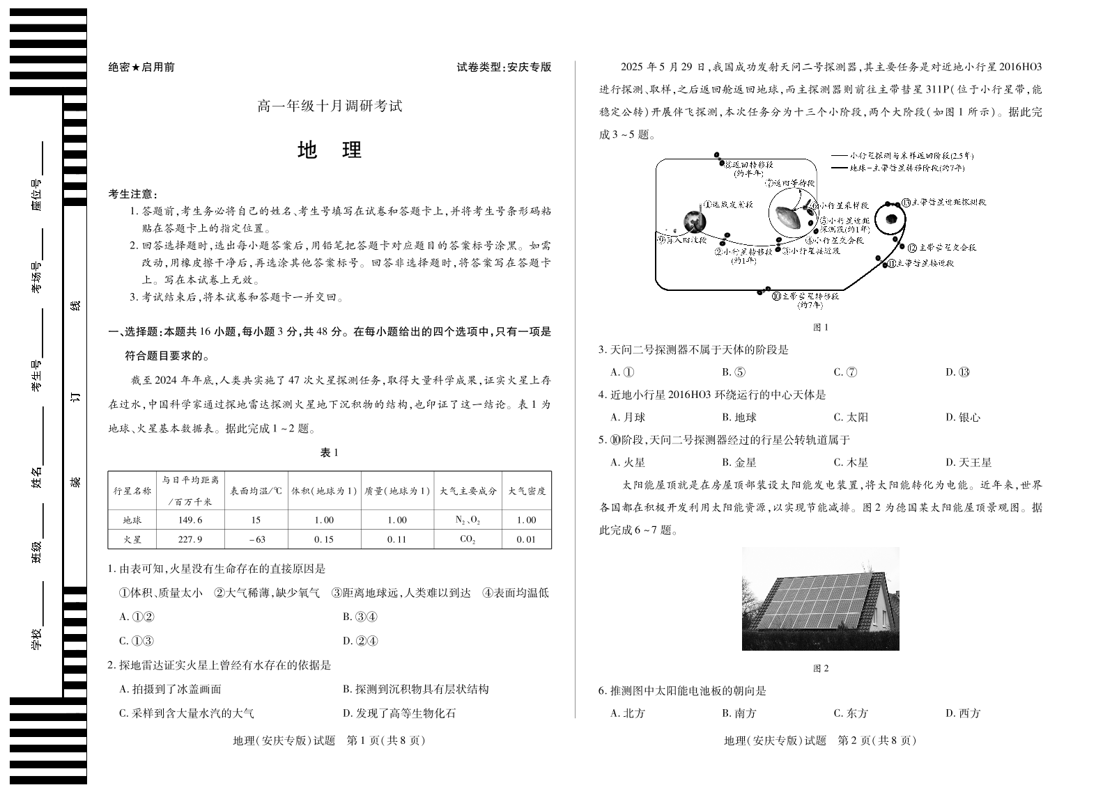高一地理(安庆专版)--安徽省天一大联考2025-2026学年上学期高一年级10月调研考试