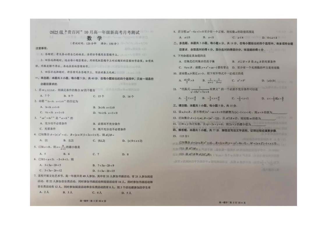 高一数学--广西贵百河2025-2026学年高一上学期10月考试卷