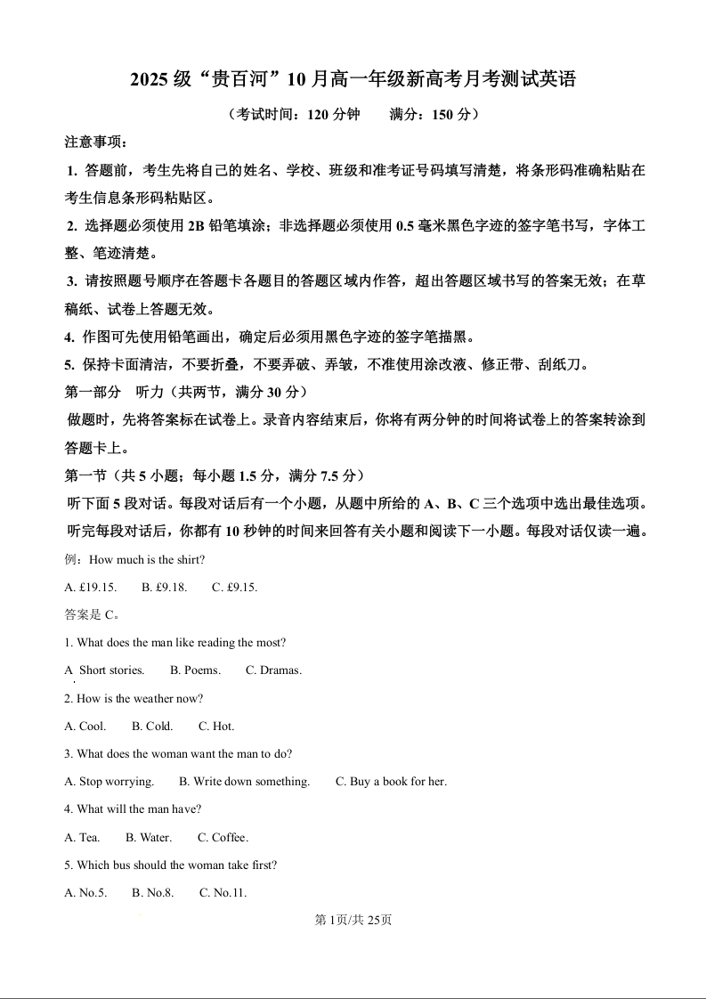 高一英语(精品解析版)--广西贵百河2025-2026学年高一上学期10月考试卷