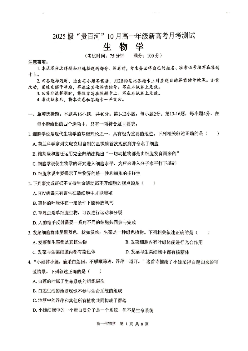 高一生物--广西贵百河2025-2026学年高一上学期10月考试卷