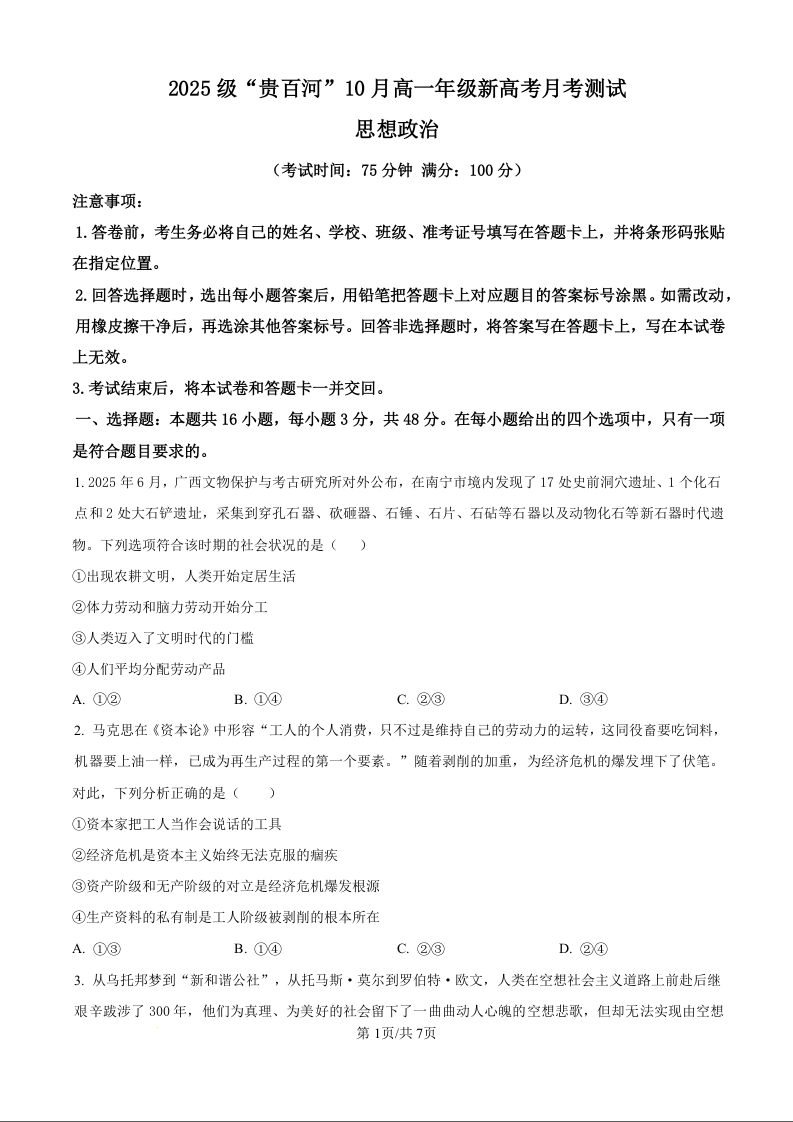 高一政治(原卷版)--广西贵百河2025-2026学年高一上学期10月考试卷